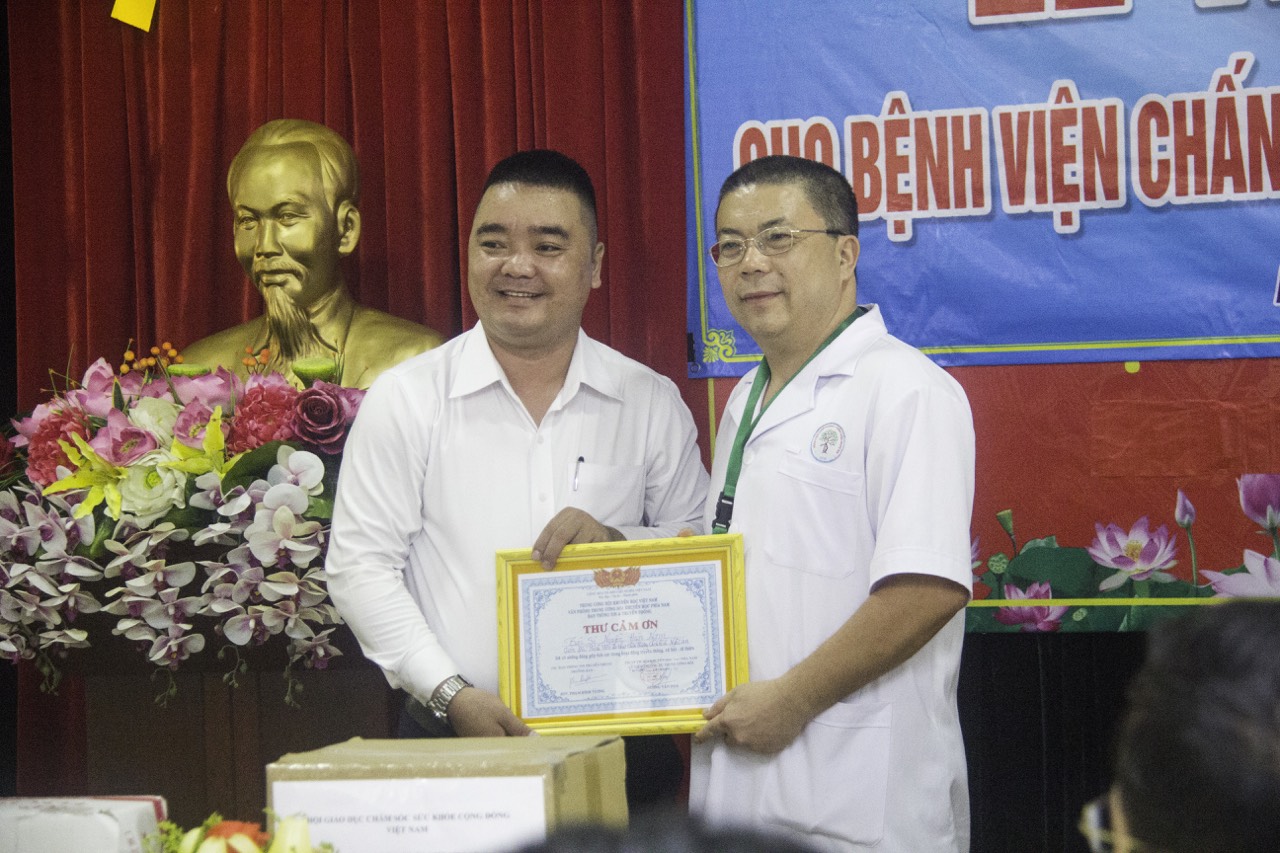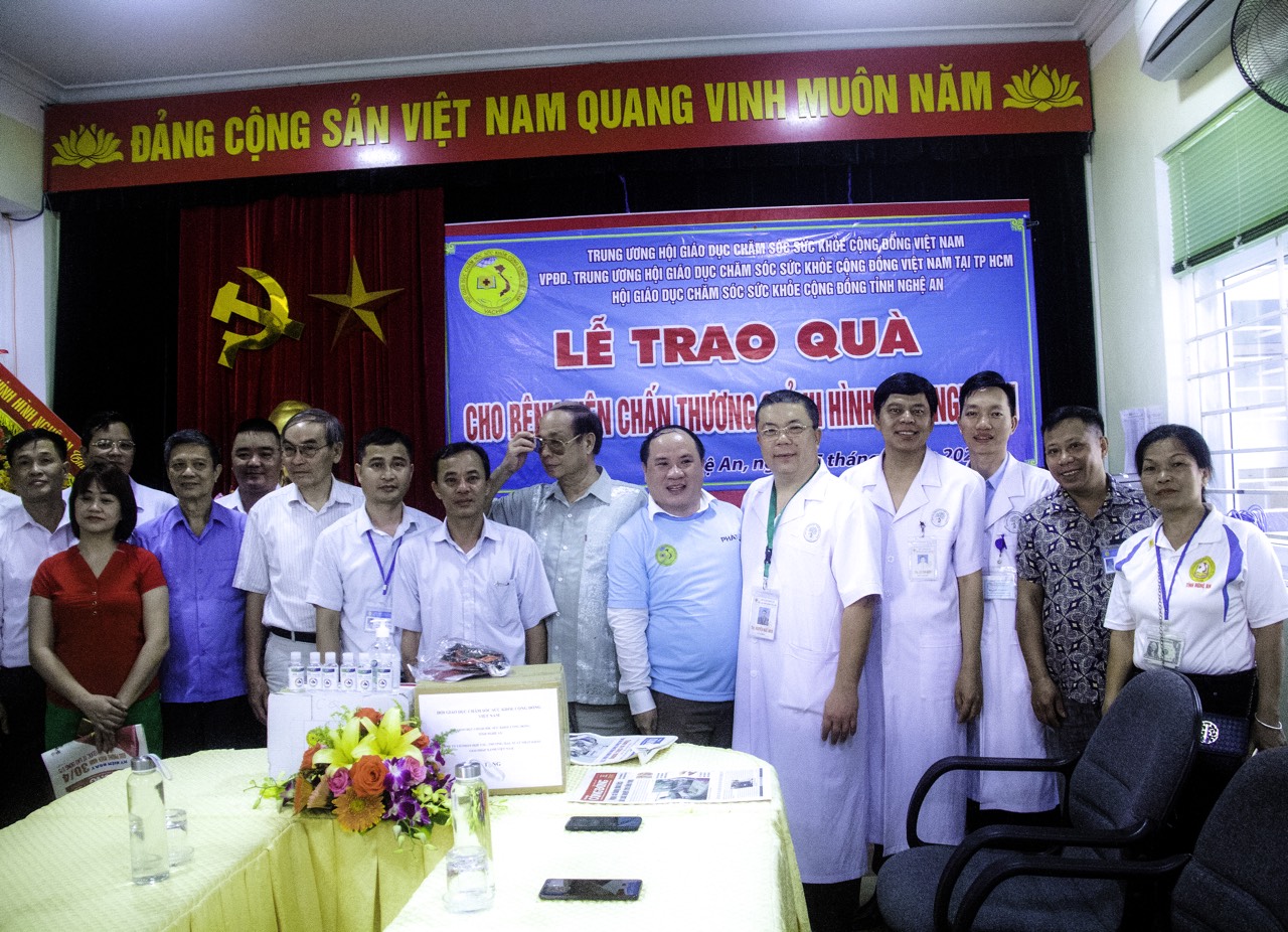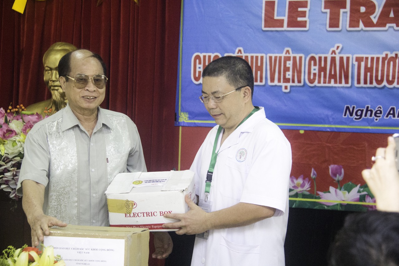 Tại buổi lễ, đại diện Hội GDCSSKCĐ đã trao những món quà thiết thực, gồm: máy rửa tay sát khuẩn, nước rửa tay sát khuẩn và khẩu trang cho BVCTCHNA.