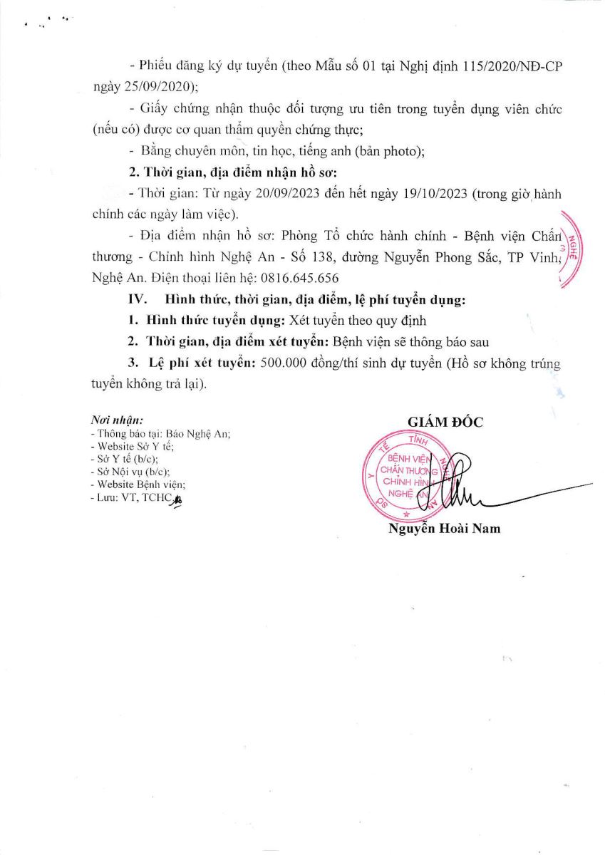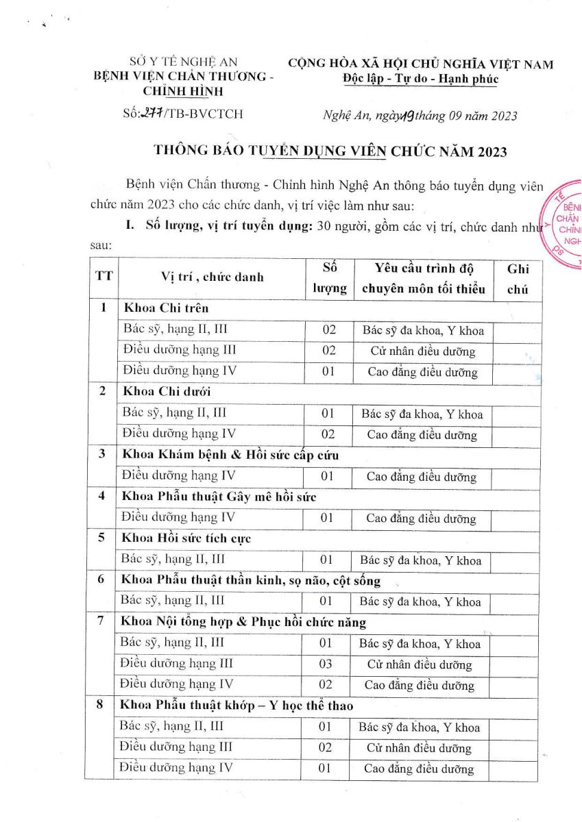 Bệnh viện Chấn thương Chỉnh hình Nghệ An xin thông báo tuyển dụng viên chức năm 2023 như sau: